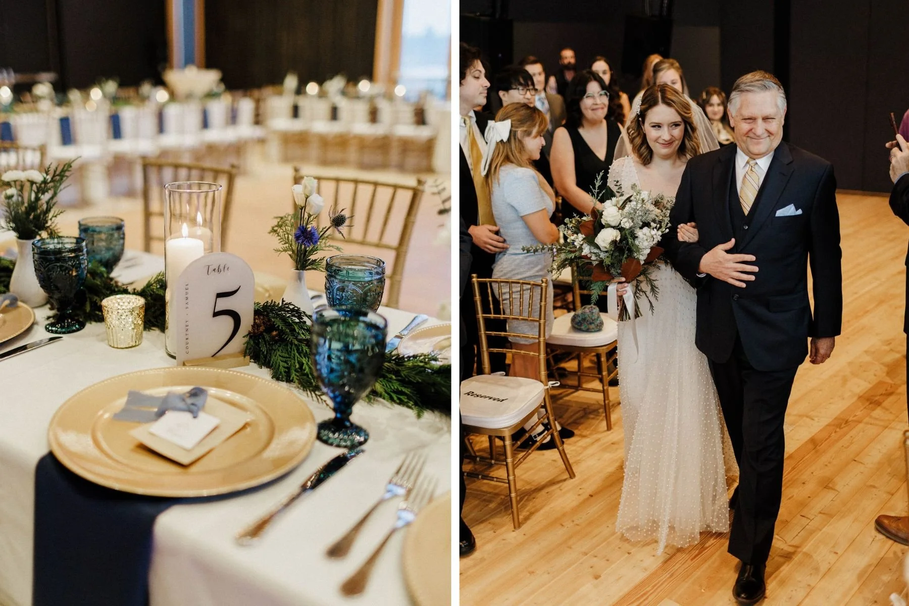 Courtney’s dress, adorned with pearls, looked like it was covered in perfect little snowflakes and just shined in the winter light. The couple’s wedding party looked sharp in winter jewel tones and velvet textures. The design focused on white, blue, and gold which was reflected in the flower arrangements, linen, and specialty chiavari chair rental.